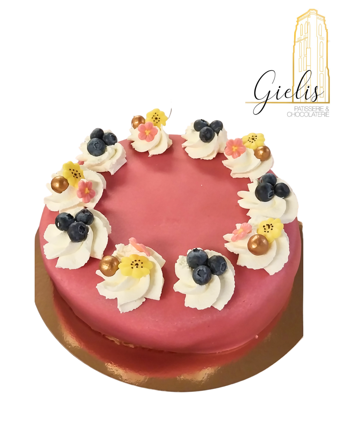 Gedecoreerd met echte marsepein, slagroom en vers fruit.